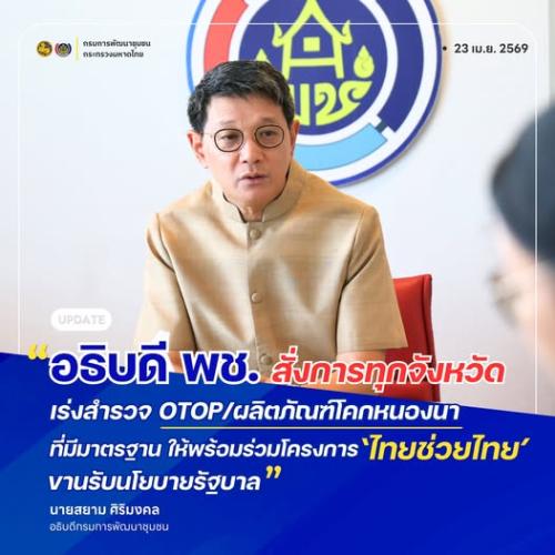 วันที่ 23 เมษายน พ.ศ. 2569 นายสยาม ศิริมงคล อธฺิบดีกรมการพัฒนาชุมชน ได้ร่งผลักดันนโยบายรัฐ 'ไทยช่วยไทย' สั่งการทั่วประเทศเร่งวางแผนมาตรการลดภาระ